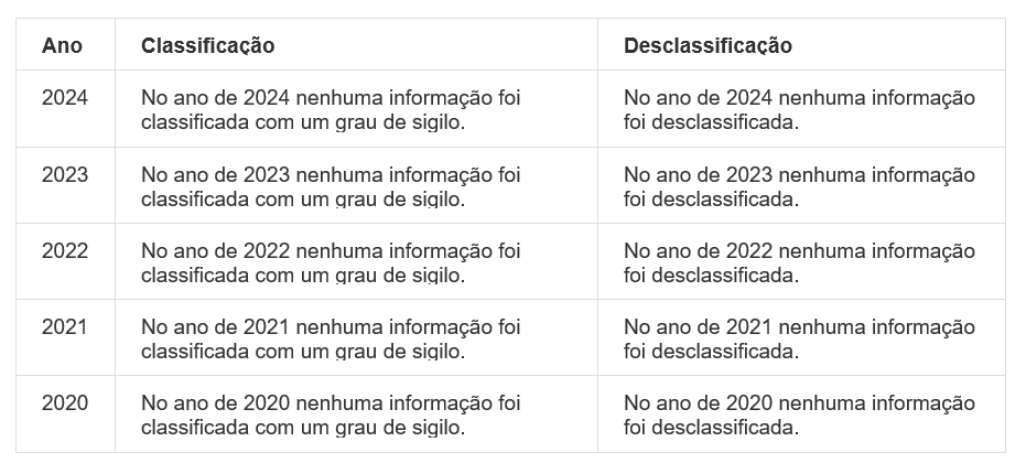 ● Não houve registro de informações classificadas e desclassificadas no ano de 2024;